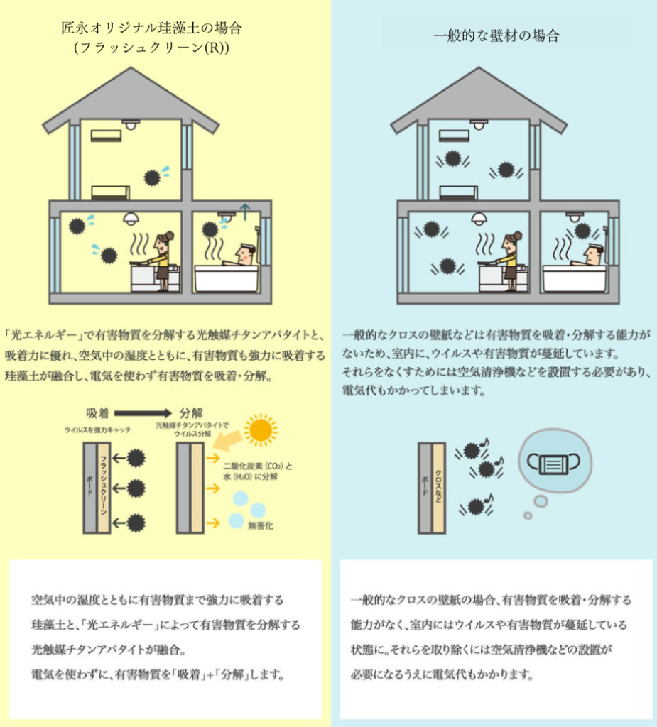 匠永工務店では、昨今の化学物質を使用した高気密住宅の安全性に疑問を感じ、人間に優しい住まいづくりに努めています。 こちらでは、その中で開発した抗菌内装材「匠永オリジナル珪藻土(フラッシュクリーン(R))」についてご紹介します。